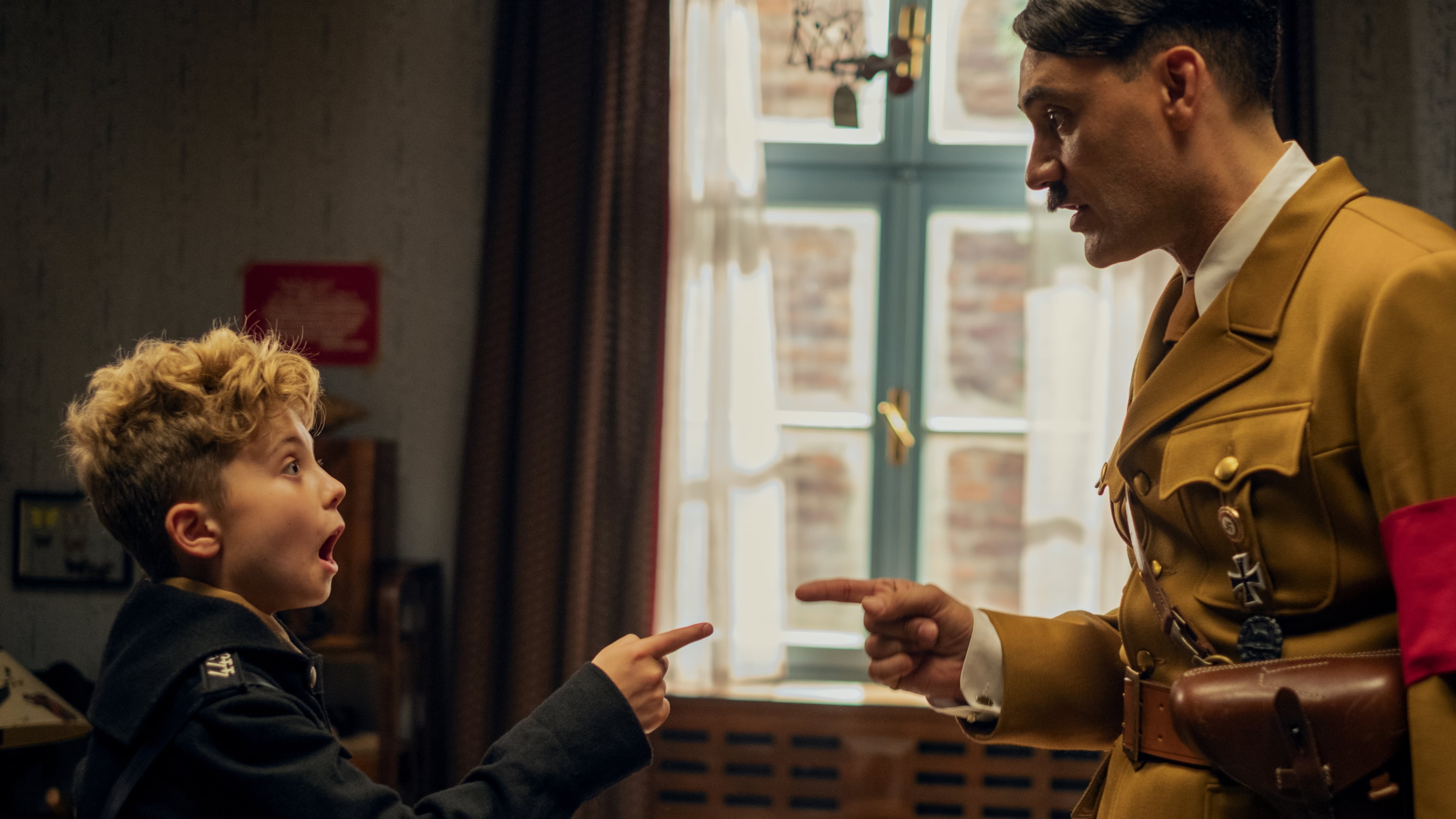 Roman Griffin Davis (Johannes "Jojo" Betzler), Thomasin McKenzie (Elsa Korr), Taika Waititi (Adolf Hitler), Scarlett Johansson (Rosie Betzler), Sam Rockwell (Captain Klenzendorf), Rebel Wilson (Fraulein Rahm), Alfie Allen (Sub-Officer Finkel), Stephen Merchant (Captain Deertz), Luke Brandon Field (Christoph)
