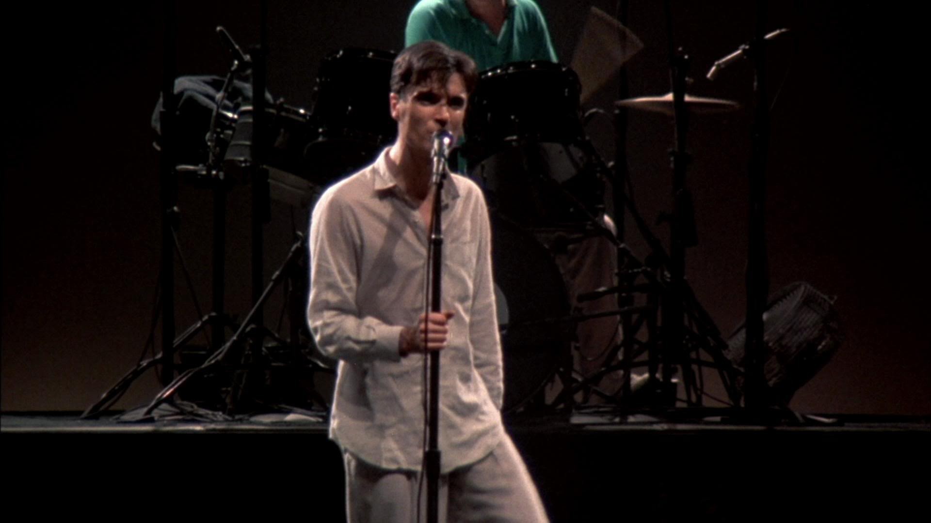 David Byrne walks onto the stage and does a solo "Psycho Killer". Jerry Harrison, Tina Weymouth and Chris Frantz join him for two more songs. The crew is busy, still setting up. Then, three more musicians and two back-up singers join the band. Everybody sings, plays, harmonizes, dances, and runs. In this concert film, the Talking Heads hardly talk, don't stop, and always make sense.
